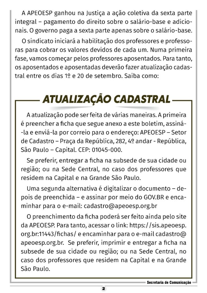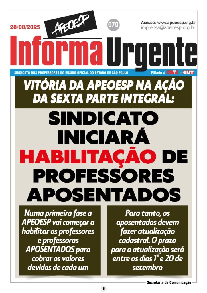 BOLETIM INFORMA URGENTE 70 VITÓRIA DA APEOESP NA AÇÃO DA SEXTA PARTE INTEGRAL: SINDICATO INICIARÁ HABILITAÇÃO DE PROFESSORES APOSENTADOS 9 set 2025, 10:28 Tempo de leitura: 0 minutos, 5 segundos Procure a Subsede:Rua Abel Seixas, 98 Santo Amaro – São Paulo/ SPTelefones: 11- 5781482611 56814194 image/svg+xml image/svg+xml image/svg+xml