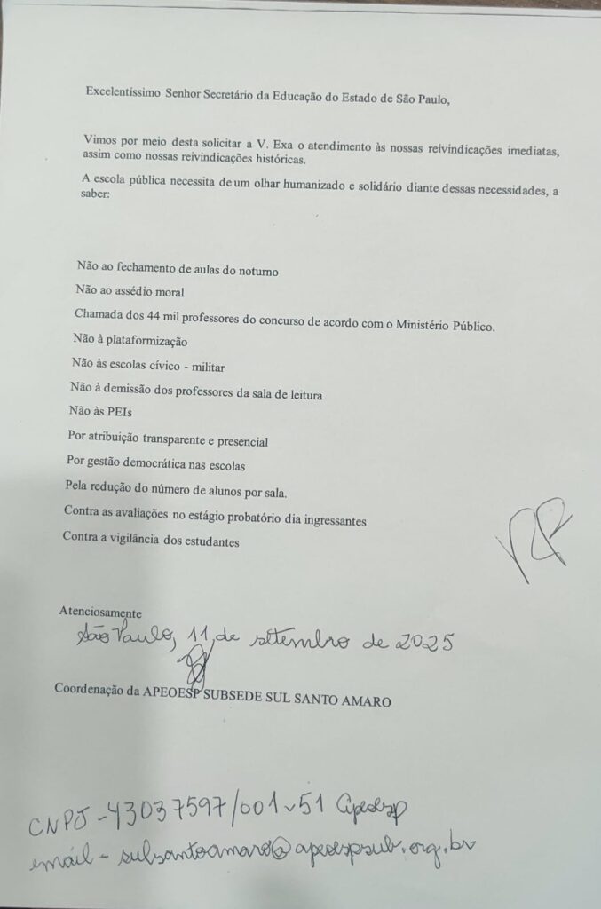 APEOESP SUBSEDE SUL SANTO protocola pauta de reivindicações junto ao secretário de educação do Estado de São Paulo, Feder, numa escola da Zona Sul , na manhã de 11 de setembro de 2025.