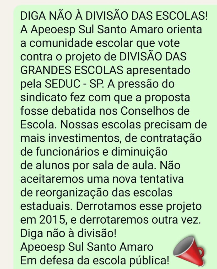 APEOESP Subsede Sul Santo Amaro contra a farsa da reorganização das escolas